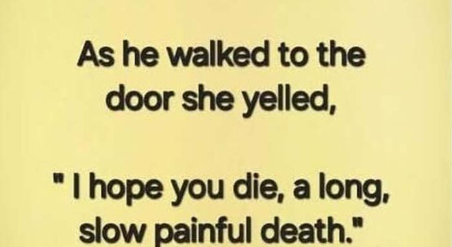 A wife got so mad at her husband that she packed his bags and told him to leave. As he walked to the door, she yelled, “I hope you die a long, slow, painful death!”