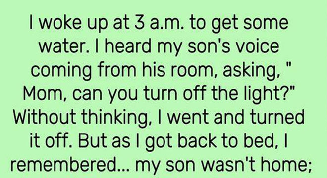 I woke up at 3 a.m. to get some water. I heard my son’s voice coming from his room, saying, “Mom, can you turn off the light?” Without thinking, I switched it off. As I got back to bed, I realized… my son wasn’t home; he was on a camping trip. I rushed to his room and froze—it was empty. I was sure I had heard his voice, or at least someone speaking in a sleepy tone. When I told my husband, he just laughed and said it was probably all in my head, but I know what I heard. That moment still freaks me out.