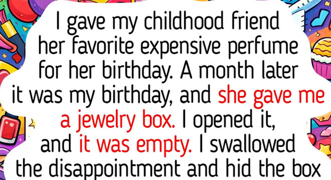 I gave my childhood friend her favorite expensive perfume for her birthday. A month later it was my birthday, and she gave me a jewelry box. I opened it, and it was empty. I swallowed the disappointment and hid the box in the closet.