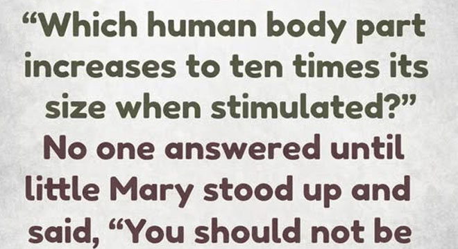 Finally, Billy stood up, looked around nervously, and said, “The body part that increases 10 times its size when stimulated is the pupil of the eye.”
