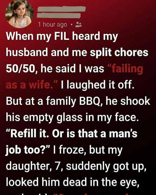 At first, it didn’t seem like a big deal. When my father-in-law found out that my husband and I shared responsibilities at home—cooking, cleaning, raising our daughter together—he let out a short laugh and shook his head. Then he said it, casually, like it was nothing: “Well, sounds like you’re failing as a wife.” I didn’t react. Not really. I smiled politely, shrugged it off, and let the conversation move on. I’ve learned over time that not every comment deserves a response. Some things are better ignored, especially when they come from people set in their ways. Still, the words