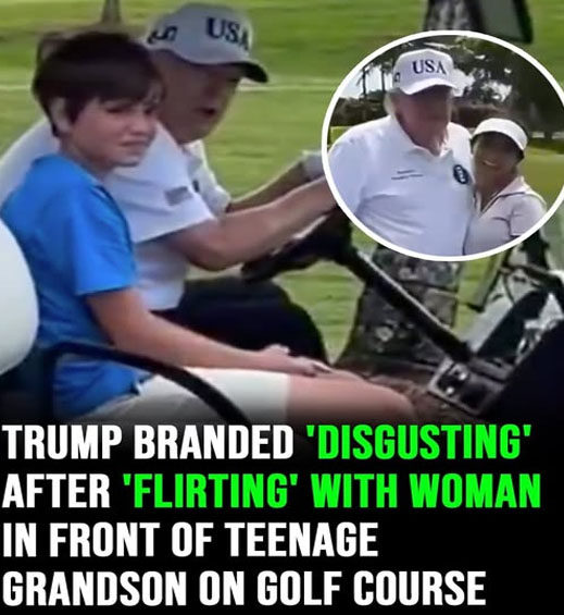 Trump was back on the golf course when the world least expected it. Not in a quiet, private moment, but in a scene that left millions stunned. A rare video shows him in a golf cart beside his young grandson, loudly appraising a woman’s body, then beckoning her over for a photo. The internet exploded, branding him “disgusting,” “embarrassing,” and unfit to represent a nation already reeling from war, inflation, and moral exha… Continues…