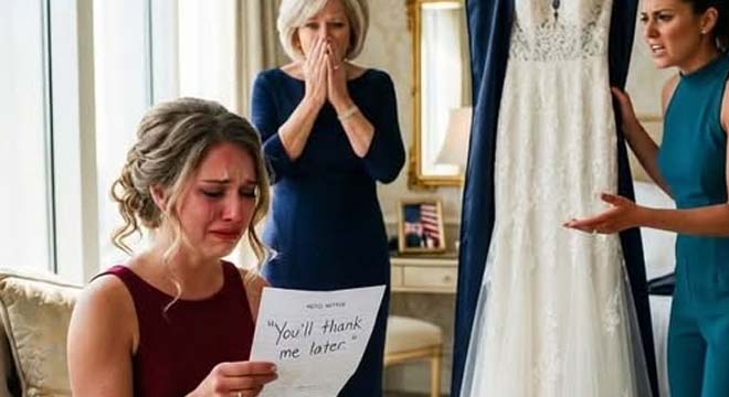 My mother, Elena, followed seconds later, carrying two cups of coffee. She froze when she saw the dress and set them down immediately, as if she’d forgotten why she was holding them.