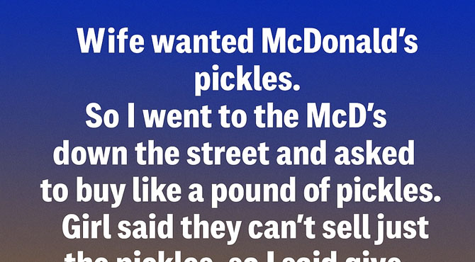 One evening, my wife had a sudden craving for McDonald’s pickles. Knowing how important it was to her, especially now that she was pregnant, I headed to the nearest McDonald’s hoping to buy just a container of pickles. When I asked the cashier, she politely explained that they couldn’t sell pickles on their own. I left, feeling a mix of frustration and determination—I didn’t want to go home empty-handed.