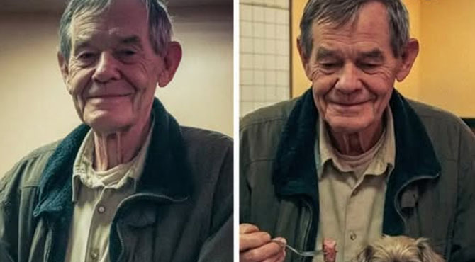 When I brought everything out, I placed the full meal in front of the old man and bent down to place the saucer on the floor. The dog looked up at me like I was some kind of magician.